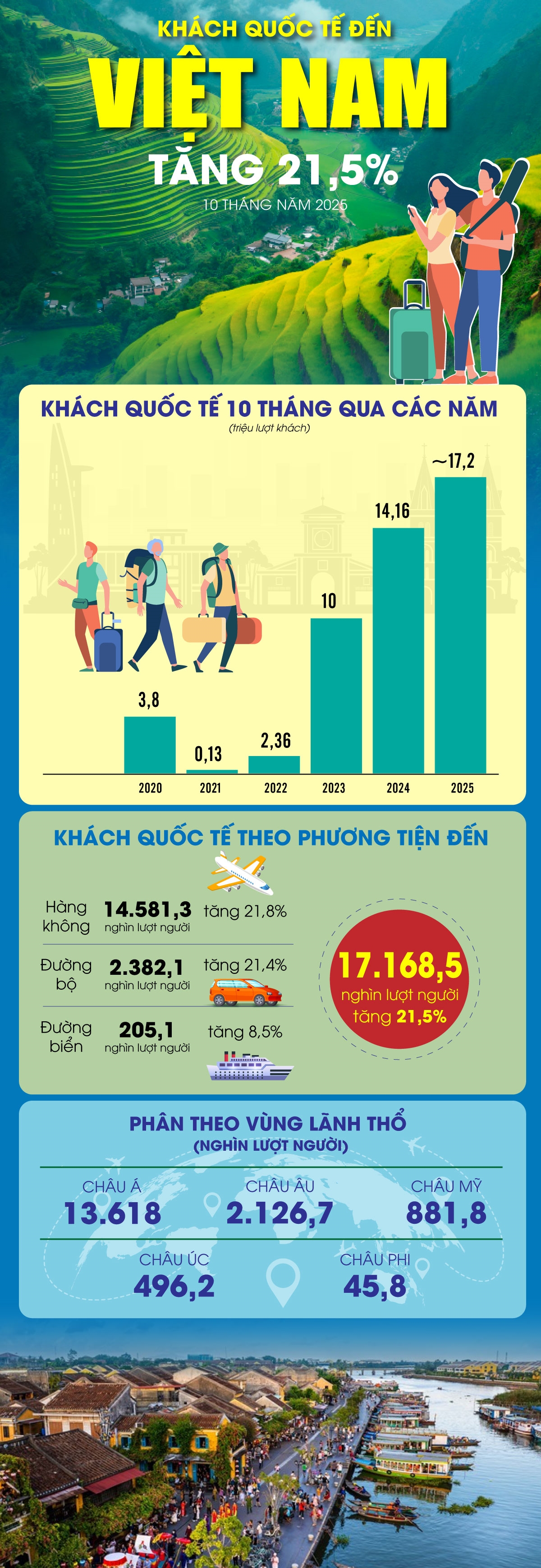 10 tháng năm 2025, khách quốc tế đến Việt Nam đạt gần 17,2 triệu lượt người, tăng 21,5% so với cùng kỳ năm trước.