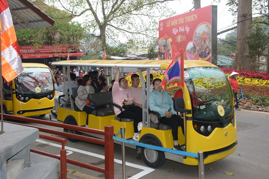 | Xe điện đưa đón du khách lên khu vực cáp treo Tây Thiên. |