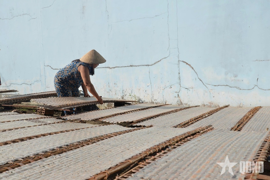 | Nếu nắng đẹp thì chỉ phơi khoảng 30 phút là bánh đã khô, nếu phơi quá khô thì bánh bị vỡ nên các công nhân phải rất chăm chút và cẩn thận. |