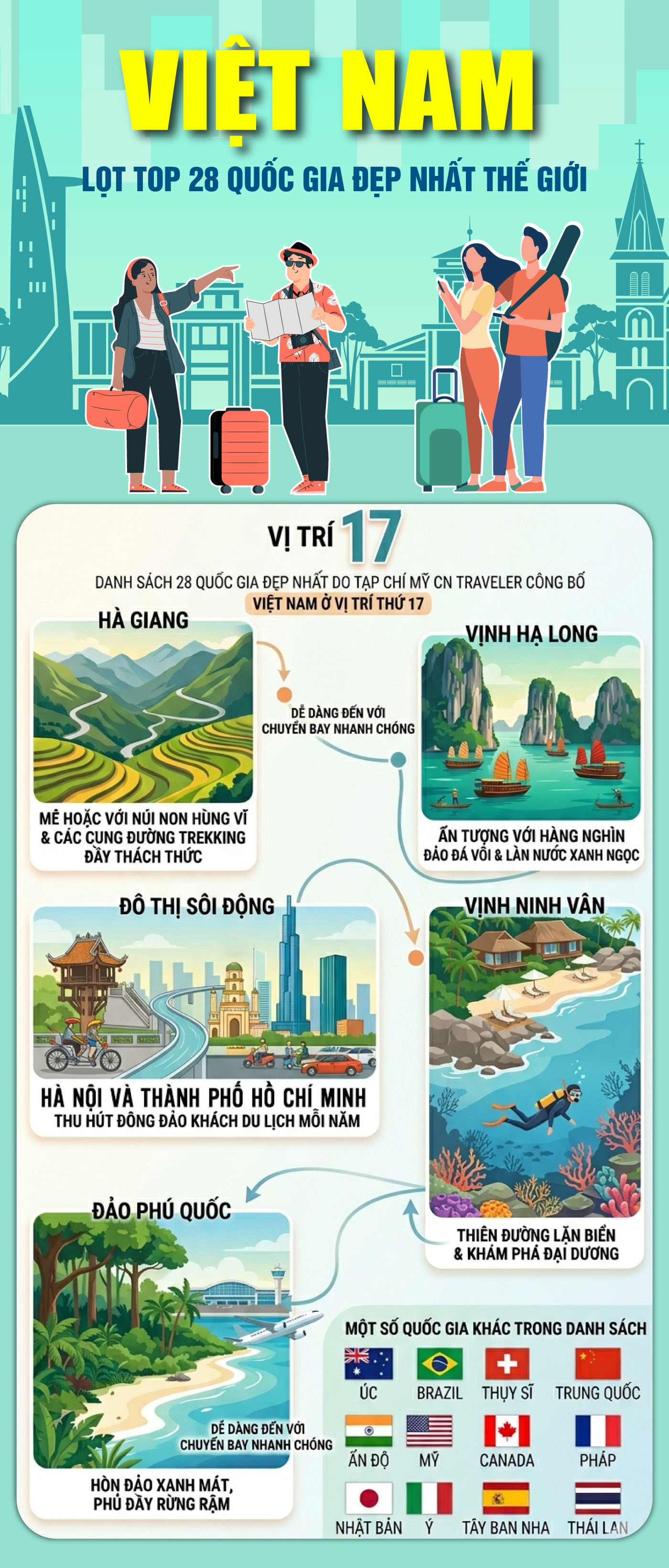 Tạp chí du lịch danh tiếng của Mỹ CN Traveler đã công bố danh sách 28 quốc gia đẹp nhất thế giới, trong đó Việt Nam góp mặt cùng nhiều điểm đến nổi tiếng toàn cầu như Trung Quốc, Mỹ, Pháp, Nhật Bản... Từ rừng mưa nhiệt đới đến những thác nước hùng vĩ, các quốc gia này hội tụ tất cả.