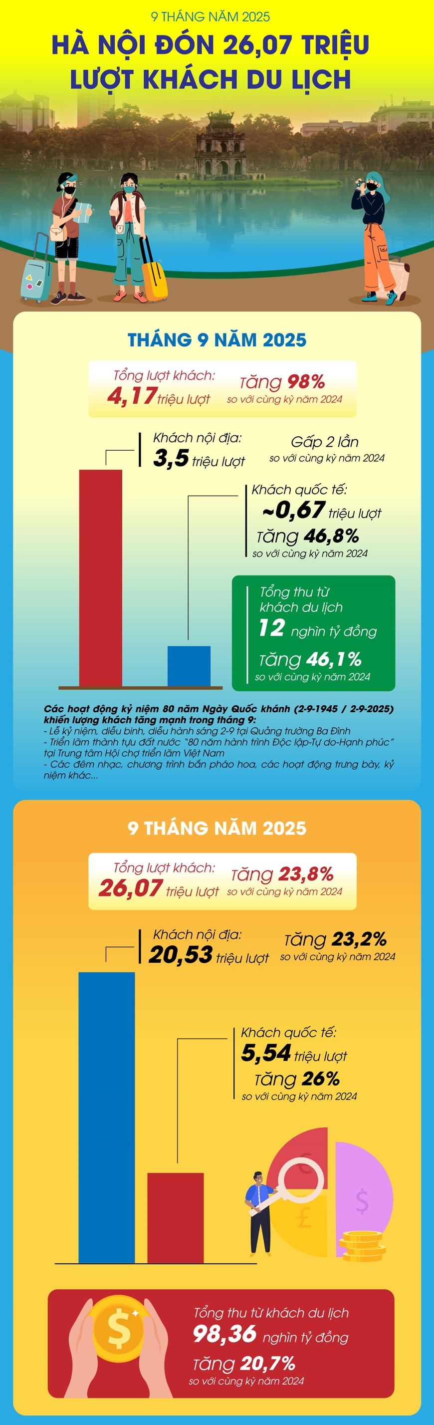 Tháng 9-2025, ngành du lịch Thủ đô đón 4,17 triệu lượt khách, tăng 98% so với cùng kỳ năm 2024. Trong đó, khách du lịch quốc tế đạt 666,7 nghìn lượt khách, tăng 46,8% so với cùng kỳ năm 2024; khách du lịch nội địa đạt 3,5 triệu lượt khách, tăng gấp 2 lần so với cùng kỳ năm 2024. Tổng thu từ khách du lịch đạt 12.000 tỷ đồng, tăng 46,1% so với cùng kỳ năm 2024.