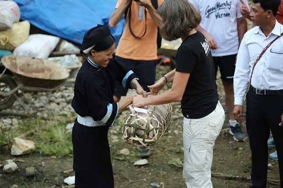 Du khách tận tay trao quà tặng người dân trong chuyến du lịch từ thiện ở Cao Bằng. |