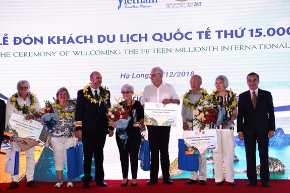 Theo thống kê, năm 2018, có hơn 15 triệu lượt khách quốc tế đến Việt Nam. Trong ảnh: Lễ đón du khách quốc tế thứ 15 triệu của Việt Nam, tại Quảng Ninh ngày 19-12-2018. |