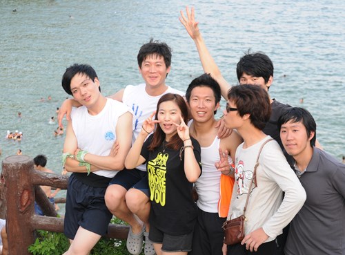 Một nhóm bạn trẻ thể hiện niềm vui khi ra thăm đảo Cát Bà.