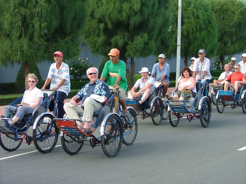 | Du khách quốc tế tham quan Hà Nội bằng xe xích lô truyền thống (ảnh chụp trước tháng 4-2021). |