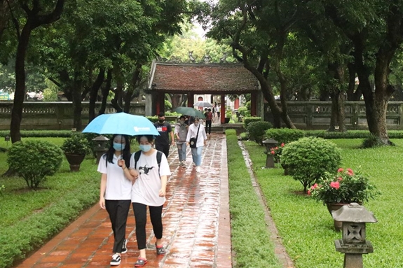 Du khách tham quan Văn Miếu-Quốc Tử Giám thực hiện đeo khẩu trang phòng, chống dịch Covid-19. Ảnh: Hải Yến. |