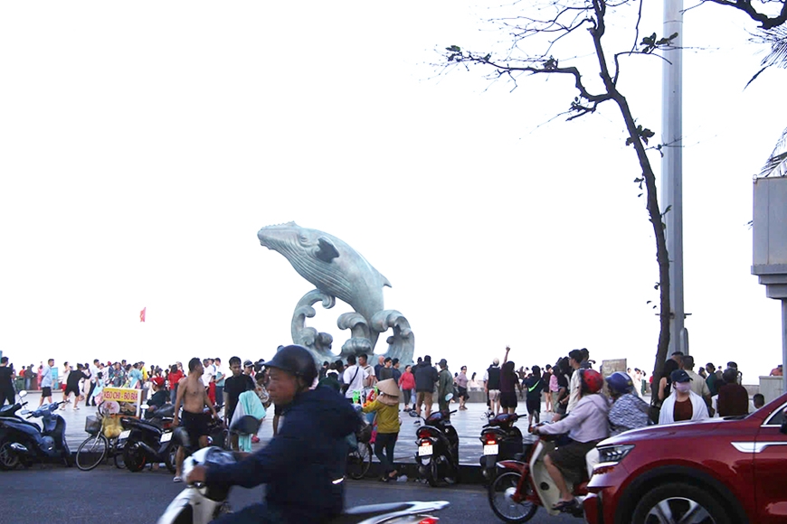 Tại khu vực Bãi Sau, ngay từ sáng sớm mồng 5, bãi biển ken kín người. Trên cát, trẻ nhỏ nô đùa, người lớn thảnh thơi dạo bước, ghi lại những bức ảnh đầu năm. Dọc công viên ven biển, từng nhóm gia đình quây quần trong nắng mới. Khu vực “Tượng cá”, tháp Tam Thắng thu hút đông đảo du khách dừng chân check-in. Ở bãi Trước (đường Hạ Long), phương tiện chật kín; các tuyến Thùy Vân, Hoàng Hoa Thám, Quang Trung, Ba Cu có thời điểm quá tải.