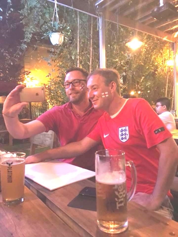 Phó đại sứ Anh Steph Lysaght (bên phải) cùng đồng nghiệp thưởng thức bia và cổ vũ bóng đá tại Hà Nội. Ảnh do nhân vật cung cấp. |