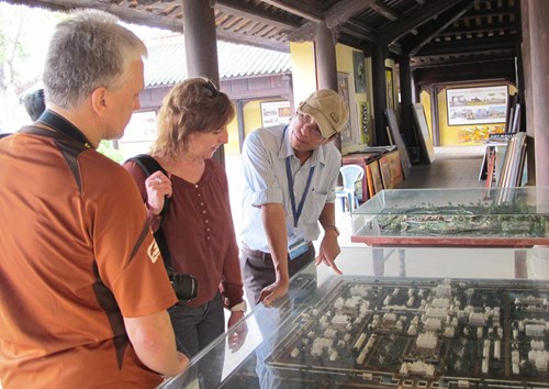 Du khách xem sa bàn tổng thể di tích Hoàng thành Huế.