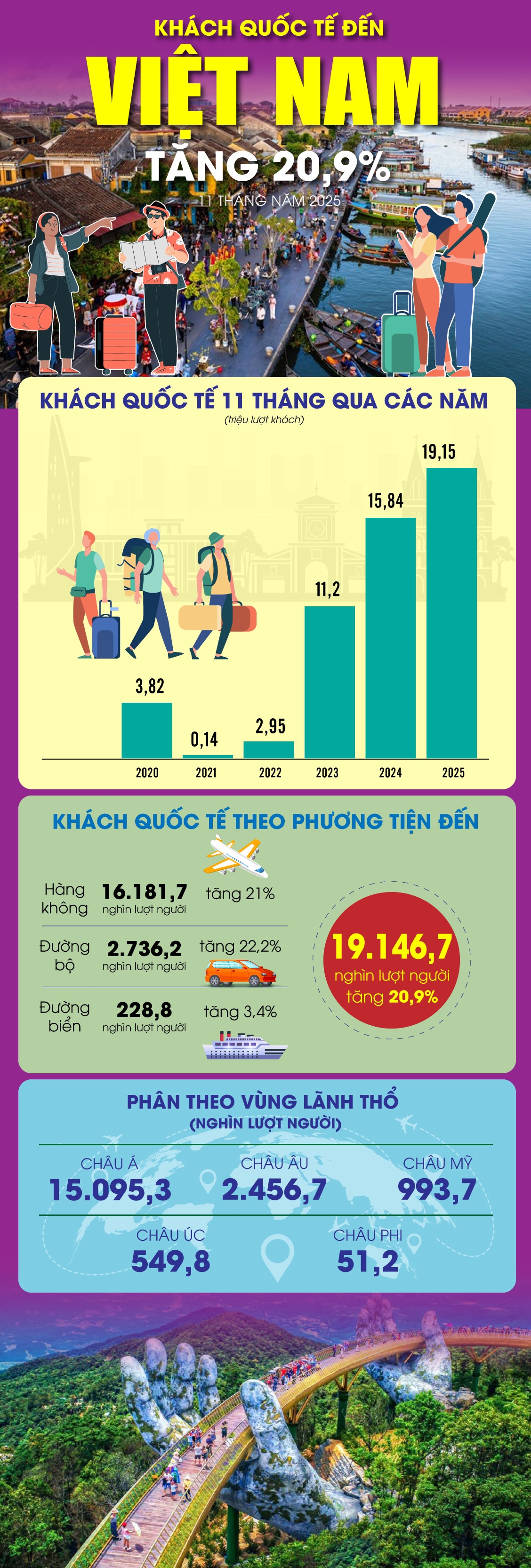 11 tháng năm 2025, khách quốc tế đến Việt Nam đạt 19,15 triệu lượt người, tăng 20,9% so với cùng kỳ năm 2024.