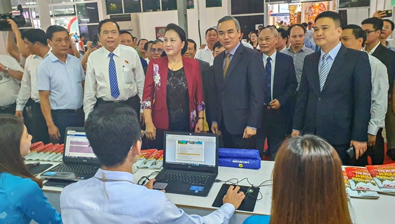 Đồng chí Nguyễn Thị Kim Ngân cùng các đồng chí lãnh đạo Trung ương, địa phương tham quan hội chợ du lịch. |