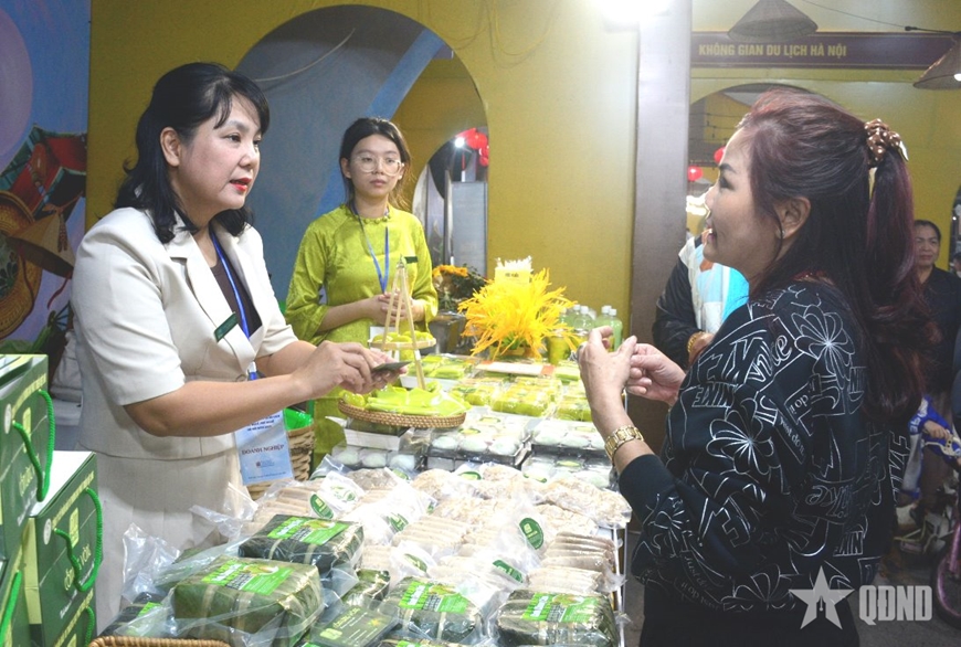 Đặc biệt, dạo bước một vòng quanh các gian hàng của liên hoan, du khách có thể cảm nhận rõ nét không khí Tết đến, Xuân về. Tại gian hàng của làng Bát Tràng, du khách được các nghệ nhân mời thưởng thức mâm cỗ Tết của người dân làng với hai món ăn trứ danh: Canh măng mực và xu hào xào mực. Gian hàng Cốm Mộc Huyền bày thêm bánh chưng cốm, xôi cốm là những món đặc biệt phục vụ cho dịp Tết. Ông Hoàng Xuân Toàn, Hợp tác xã Giò chả Ước Lễ chia sẻ: Hợp tác xã tham gia liên hoan với mong muốn mở rộng du lịch làng nghề của làng...