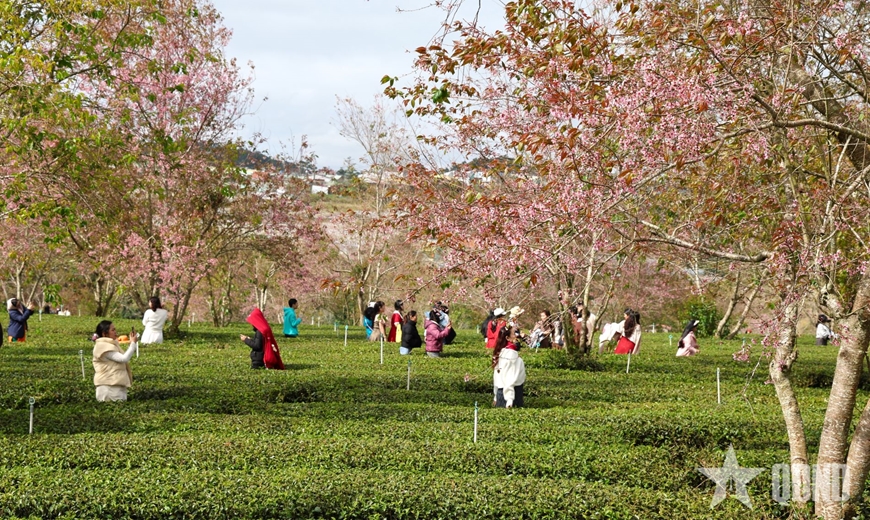 | Đông đảo du khách đến với mùa hoa mai anh đào trên đồi trà Cầu Đất. |
