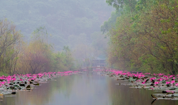 Đi được khoảng hơn nửa tiếng, mặt trời đã lên cao. Tấm màn sương mờ bắt đầu được vén dần lên, hé lộ một không gian tươi mới. Lúc này, Suối Yến như được tráng một lớp gương mới. Nước trong vắt, bằng mắt thường có thể nhìn thấy rõ rong rêu dưới mặt nước. Mọi người chạm tay xuống nước để cảm nhận dòng nước mát. Bỗng nhiên, cô bạn đồng hành cùng chúng tôi thốt lên ngạc nhiên. Theo hướng tay của người bạn, chúng tôi nhìn rõ từng thảm hoa súng đang bung nở nhuộm tím mặt nước ven bờ. Bức tranh đầy màu sắc được vẽ ra trước mắt những du khách. Dòng suối chạy dài sáng bừng lên dưới ánh mặt trời. Hàng cây, dáng núi đổ bóng xám xuống ven suối làm thu gọn đường sáng ấy. Nhưng cũng chính ở nơi có gam màu trầm ấy, sắc tím dịu dàng nổi lên gây ấn tượng mạnh vào thị giác của người xem. Chúng tôi hồi hộp, mừng rỡ khi con thuyền từ từ tiến đến, đón chờ giây phút chạm tay vào từng mảng màu đặc biệt.