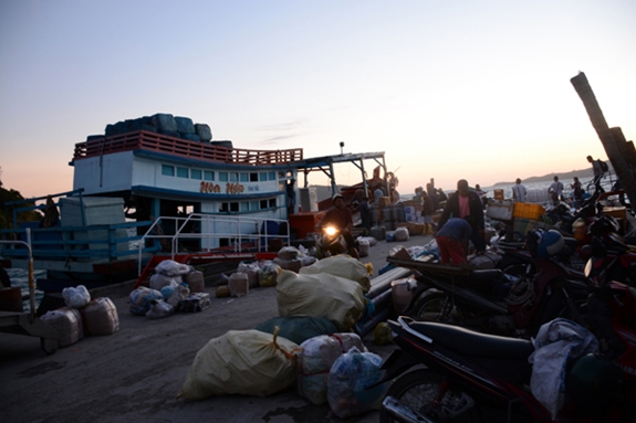 Từ sáng sớm, cảng Nam Du đã tấp nập khi tàu chở hàng hóa từ đất liền ra đảo. |