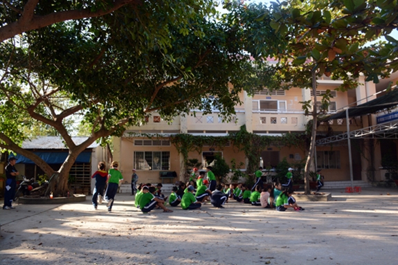 Các em học sinh Trường THCS xã An Sơn trong giờ học thể dục. |
