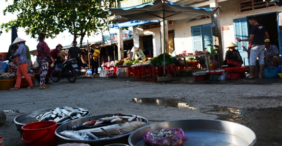 Chợ An Sơn tấp nập vào mỗi sáng với nhiều mặt hàng hải sản. |