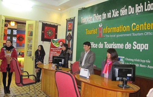 Cán bộ, nhân viên Trung tâm Thông tin và Xúc tiến du lịch tỉnh Lào Cai chuẩn bị đón khách đến tham quan, tìm hiểu tại khu du lịch Sa Pa.