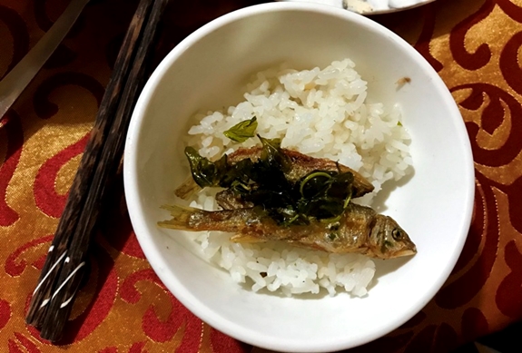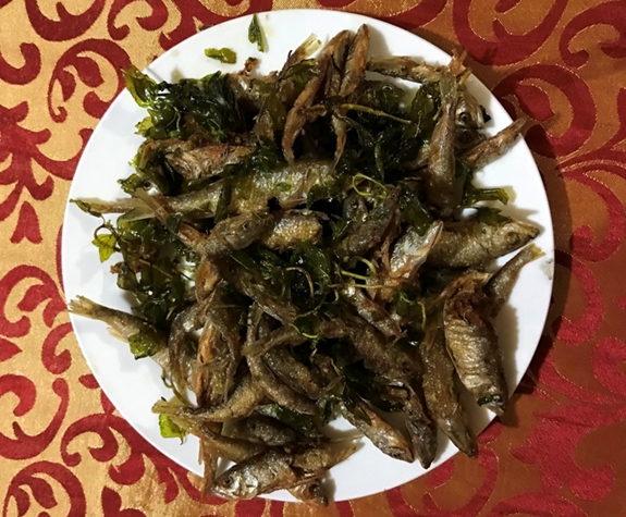 Cá suối chiên rau húng nước giòn rụm, đưa cơm. Rau húng nước là loại rau gia vị chỉ có ở Bắc Hà. Người dân nơi đây thường xuyên dùng loại rau này trong các bữa ăn, đặc biệt thích hợp với món phở chua. |