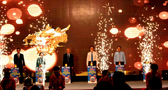 Các đại biểu bấm nút phát động chương trình kích cầu du lịch nội địa toàn quốc.