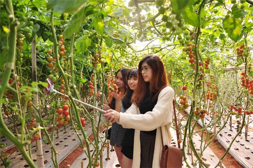 Du khách tham quan vườn cà chua công nghệ cao tại TP Đà Lạt..