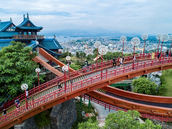 Khi cáp treo cập bến trên đỉnh Ba Đèo, bạn sẽ ngỡ ngàng hơn bởi đây mới là điểm ngắm TP Hạ Long ngoạn mục nhất. Trên đỉnh Ba Đèo, cây cầu Koi đỏ rực đang là điểm check-in “hot” không kém cây Cầu Vàng tại Sun World Ba Na Hills (Đà Nẵng).