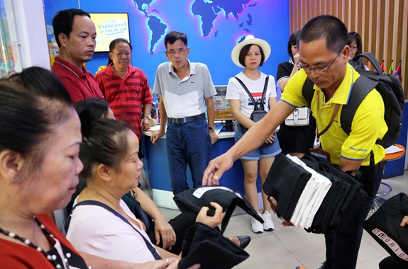Nhân viên Vietravel tặng túi vải thân thiện môi trường cho du khách. Ảnh: HÀ ANH. |