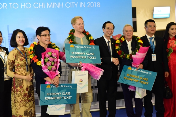 Lễ đón du khách quốc tế thứ 7 triệu đến TP Hồ Chí Minh đầu tháng 12-2018. |