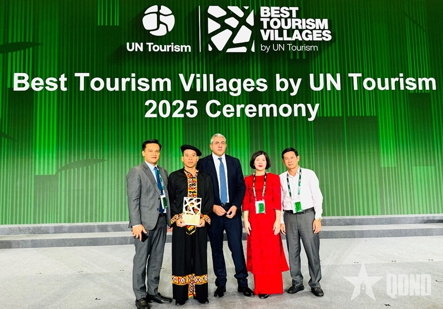 Đại diện thôn Lô Lô Chải nhận danh hiệu "Làng du lịch tốt nhất thế giới" năm 2025.