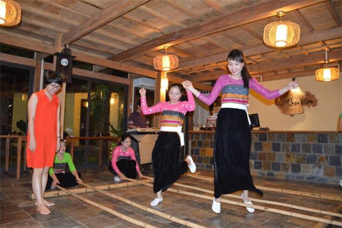 Du khách tham gia nhảy sạp cùng nhân viên của Mai Châu Villas.