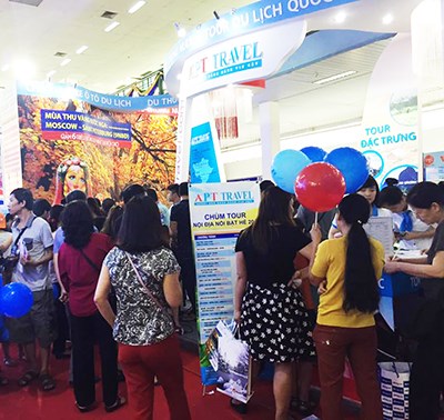 Du khách tham quan gian hàng của Công ty APT Travel trong Hội chợ Du lịch Quốc tế-VITM Hà Nội 2016.
