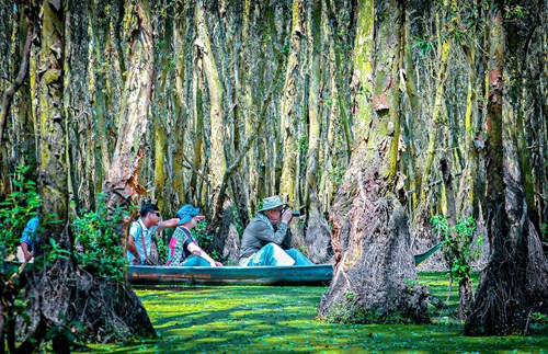 Khám phá sinh thái – nông nghiệp là một trong những loại hình được đề xuất để phát triển du lịch Đồng bằng sông Cửu Long. Trong ảnh: Khách du lịch nước ngoài tham quan rừng tràm ngập nước Trà Sư (huyện Tịnh Biên, tỉnh An Giang). |