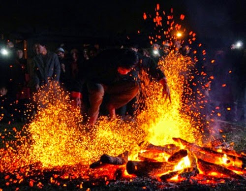 Păng…păng…păng, tiếng gõ đều đều của thanh tre trong tay thầy cúng, các động tác lắc lư của các chàng trai mạnh dần. Họ bắt đầu nhảy lò cò và tiến ra gần đống lửa. Một nguồn năng lượng nào đó nâng bổng người thanh niên nhảy bật lên bằng cả hai chân và lao vào giữa đống lửa cháy rừng rực.