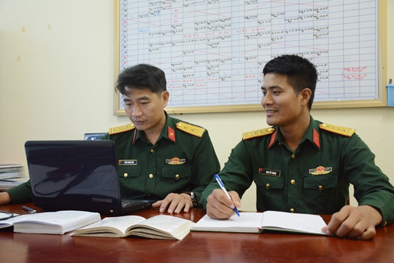 Trung tá Đàm Thanh Sơn (bên trái) chia sẻ bài dạy cùng Đại úy Ngô Tất Thành. |