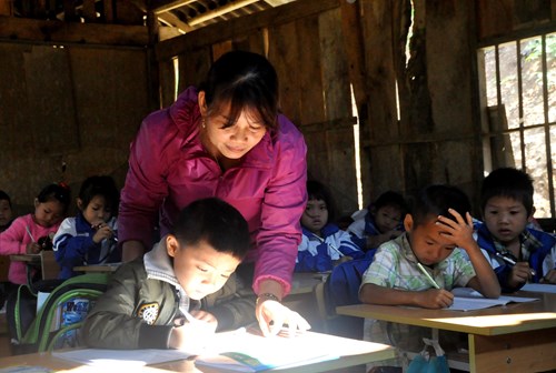 Cô giáo Lò Thị Cương, Trường Tiểu học Chiềng Hoa A (huyện Mường La, tỉnh Sơn La) nắn từng nét chữ cho các em học sinh.