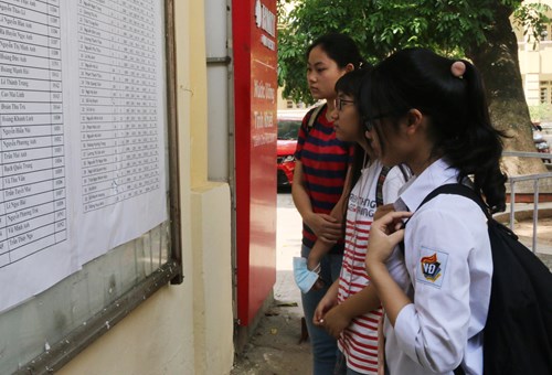 Các em học sinh tra cứu thông tin tại điểm thi Trường THPT Việt Đức, Hà Nội.