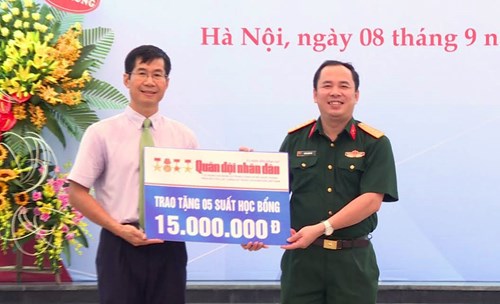 Đại tá Đoàn Xuân Bộ, Phó tổng biên tập Báo Quân đội nhân dân trao 5 suất học bổng cho các sinh viên có hoàn cảnh khó khăn, đạt kết quả cao trong kỳ thi tuyển sinh đầu vào năm 2016.