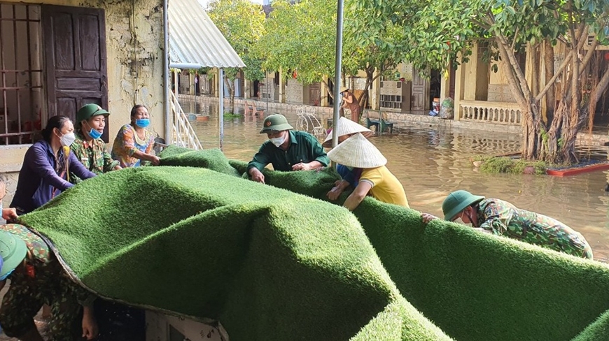 Cán bộ, chiến sĩ LLVT huyện Quỳnh Lưu giúp Trường Mầm non Quỳnh Hồng khắc phục hậu quả mưa lũ. Ảnh: ĐỨC VƯỢNG
