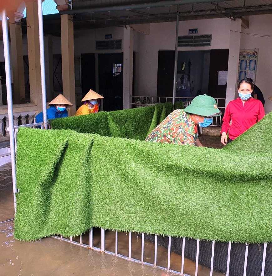 Hậu quả mưa lũ khiến hầu hết đồ dùng học tập Trường Mầm non Quỳnh Diễn bị hư hỏng. Ban CHQS huyện đã huy động 20 cán bộ, chiến sĩ giúp nhà trường vận chuyển đồ dùng, thiết bị dạy học sang dãy nhà mới. Quãng đường vận chuyển sang địa điểm mới khoảng 500m. Với sự nỗ lực của cán bộ, chiến sĩ, cuối buổi chiều, công việc tại Trường Mầm non Quỳnh Diễn cơ bản hoàn tất. Cô giáo Trần Thị Lan, Hiệu trưởng Trường Mầm non Quỳnh Diễn cảm kích: “Nhờ các chú bộ đội giúp sức, nhà trường đã khắc phục được hậu quả, có thể dạy học lại vào tuần tới...”.