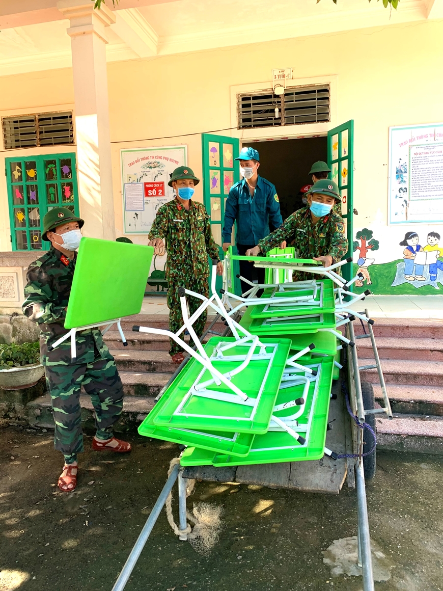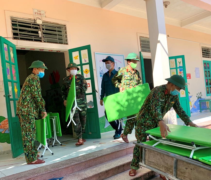 Cán bộ, chiến sĩ giúp Trường Mầm non Quỳnh Diễn vận chuyển thiết bị dạy học đến địa điểm mới. Ảnh: HOA LÊ