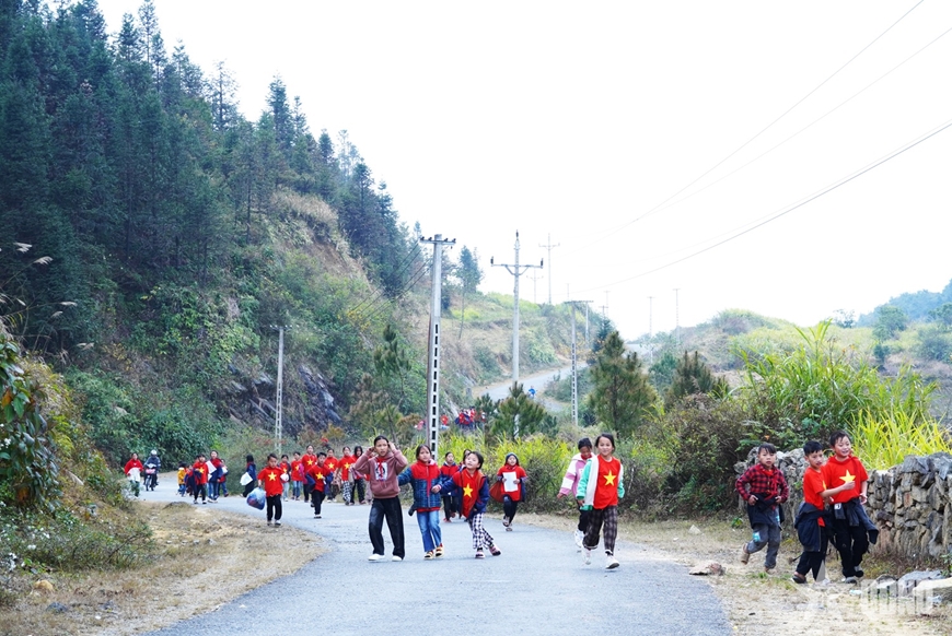 | Nụ cười tươi, sự hào hứng hiện rõ trên gương mặt học sinh Trường Phổ thông Dân tộc bán trú Tiểu học Thượng Phùng, xã Sơn Vĩ (Tuyên Quang) trong hành trình trải nghiệm “Tiết học biên cương”, tự hào mang theo lá cờ Tổ quốc. |