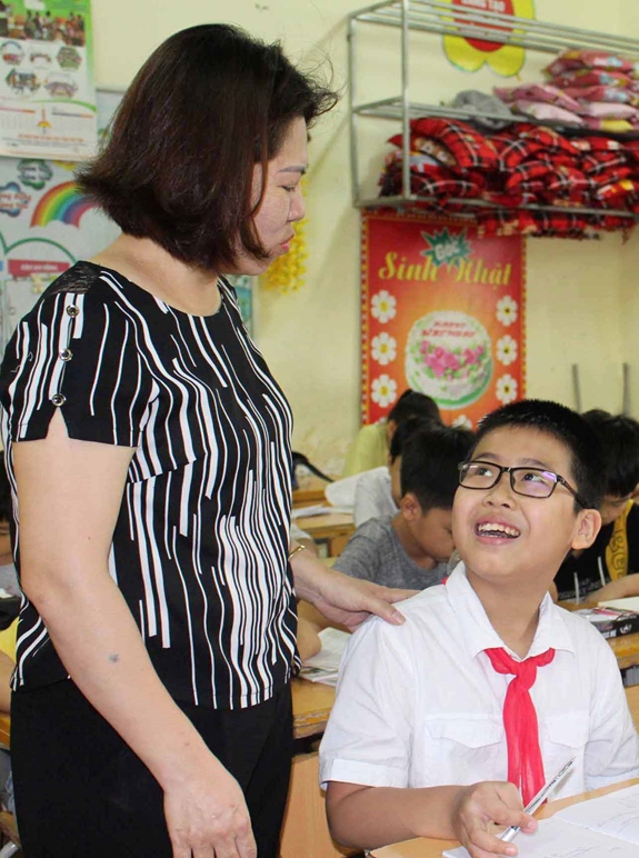 Cô giáo chủ nhiệm Lớp 4C và em Vũ Hoàng Sơn. |