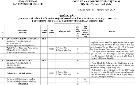 Theo đó, hệ đào tạo đại học sẽ có 25 chỉ tiêu bổ sung, trong đó HV Phòng không Không quân là 20 và Trường Sĩ quan Phòng hóa là 5, với mức điểm từ 15 trở lên.