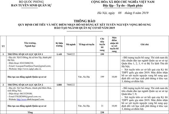 * Hệ đào tạo cao đẳng ngành Quân sự cơ sở cũng bổ sung thêm 230 chỉ tiêu, trong đó Trường Sĩ quan lục quân 1 là 199 chỉ tiêu và Trường Sĩ quan lục quân 2 là 31 chỉ tiêu, với mức điểm nhận hồ sơ xét tuyển là 10.