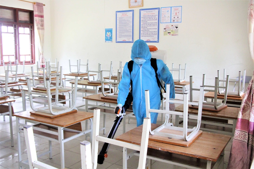 | Phun khử khuẩn tại trường học ở huyện Cô Tô, tỉnh Quảng Ninh để chuẩn bị năm học mới. Ảnh: HOÀNG PHƯƠNG. |