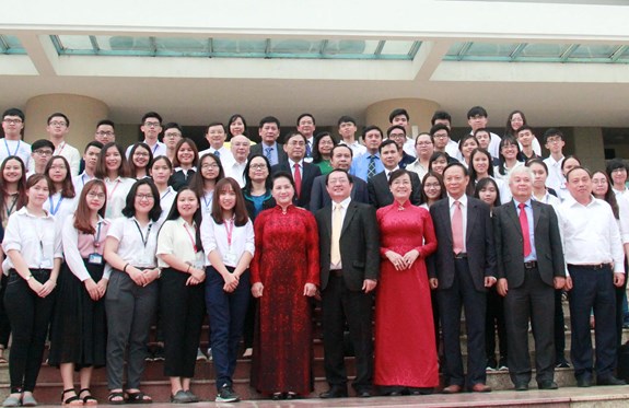 Chủ tịch Quốc hội Nguyễn Thị Kim Ngân với các đại biểu, thầy và trò ĐHQG TP Hồ Chí Minh. |