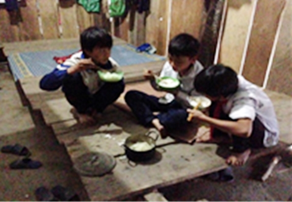 Các em học sinh bán trú tự túc nấu cơm sáng. Ảnh: Vân Nhi |