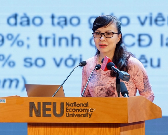 Vụ trưởng Vụ Giáo dục ĐH Nguyễn Thị Kim Phụng phát biểu tại hội nghị. |