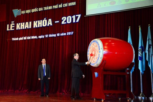 Đồng chí Nguyễn Thiện Nhân, Ủy viên Bộ Chính trị, Bí thư Thành ủy TP Hồ Chí Minh đánh trống khai khóa năm học 2017-2018 của ĐHQG TP Hồ Chí Minh.