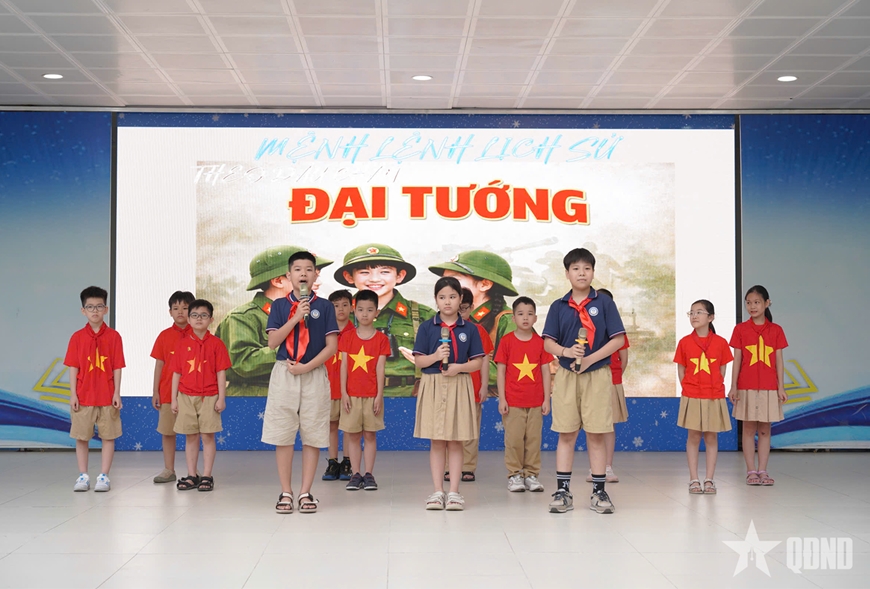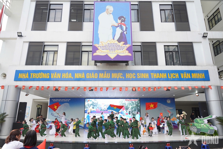 Nếu phần giao lưu mang lại tri thức thì tiết mục sân khấu hóa “Bản hùng ca thống nhất - Đất nước trọn niềm vui” lại chạm tới cảm xúc. Hình ảnh những “chú bộ đội nhí”, “cô dân quân nhỏ bé” do học sinh lớp 1A5 thể hiện không chỉ là một màn biểu diễn, mà còn là sự nhập vai, là cách để các em trải nghiệm trong những năm tháng lịch sử, những thời khắc thiêng liêng của dân tộc.